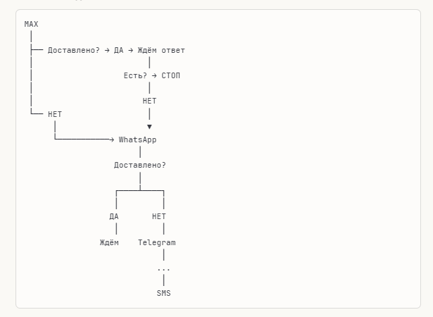 ✅ Каскады — MAX → WhatsApp → Telegram → SMS