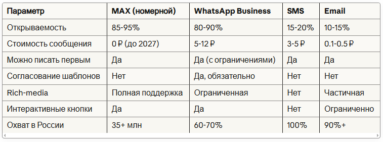 Номерные рассылки в MAX решают эти проблемы: открываемость 85-95%, бесплатный API до 2027 года, нет жёстких ограничений на шаблоны.