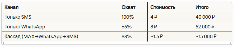 Для максимальной эффективности рекомендуется использовать каскадные рассылки (MAX → WhatsApp → SMS), которые обеспечивают 98% охват базы при минимальных затратах.