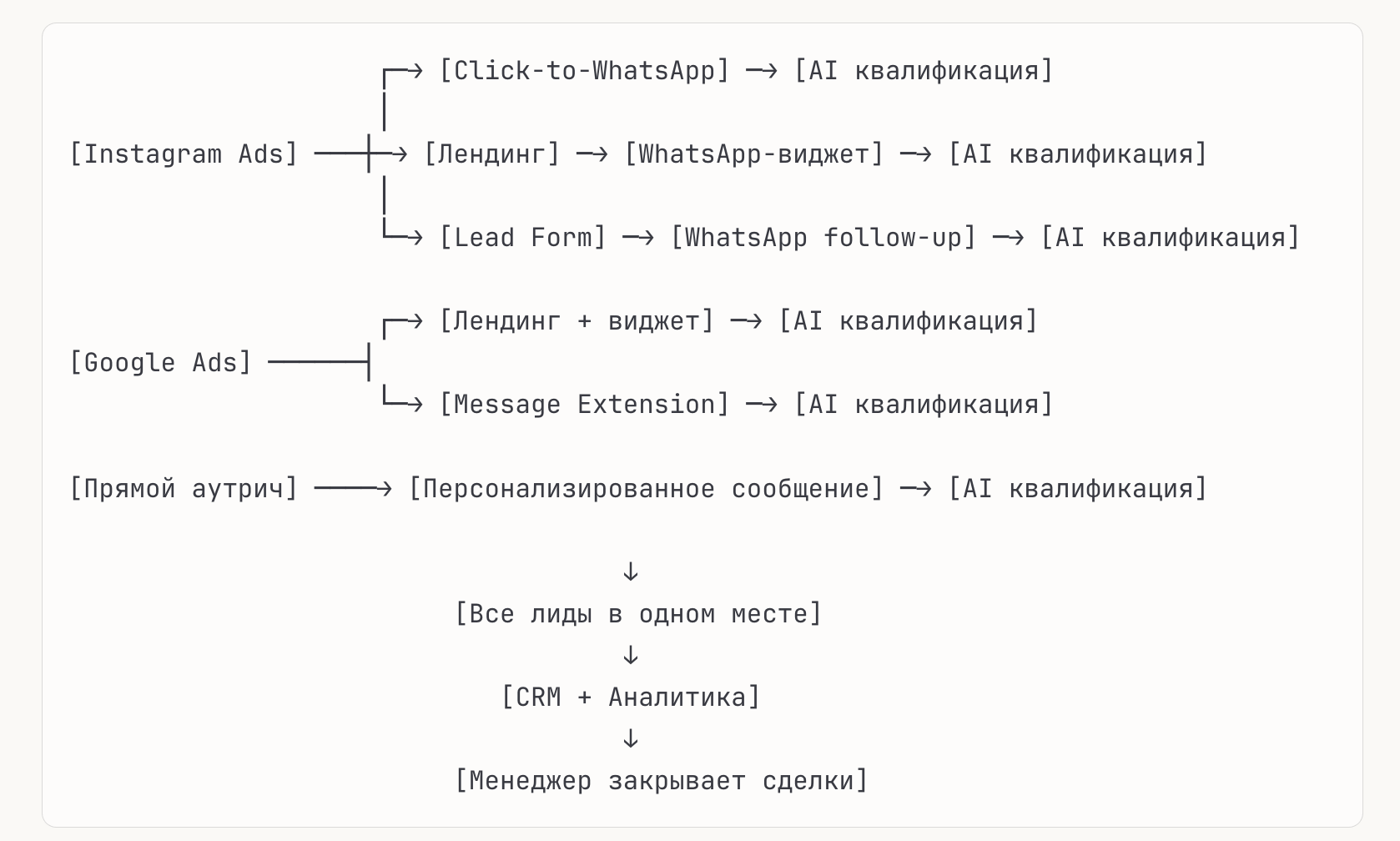 - Мультиканальность WhatsApp + Instagram DM + Telegram (популярен в некоторых странах MENA)