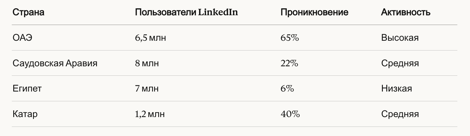 - Низкая активность в Саудовской Аравии и Египте В отличие от ОАЭ, где LinkedIn популярен, в крупнейших рынках региона (KSA, Египет) активность низкая.