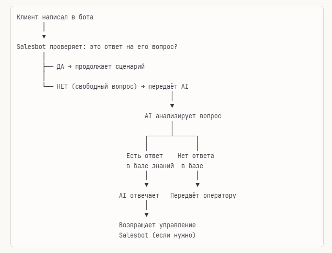 - Salesbot + AI работают вместе — структурированные сценарии для типовых ситуаций, AI для свободных вопросов