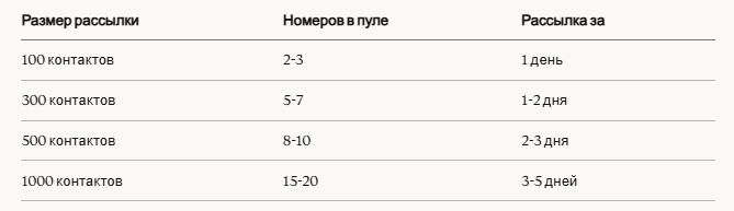 Для масштабных рассылок используют пулы — несколько номеров, между которыми распределяется нагрузка.