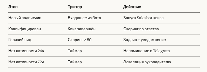 - Digital Pipeline запускает автоматические сценарии — смена этапа → сообщение в Telegram, ответ → задача менеджеру