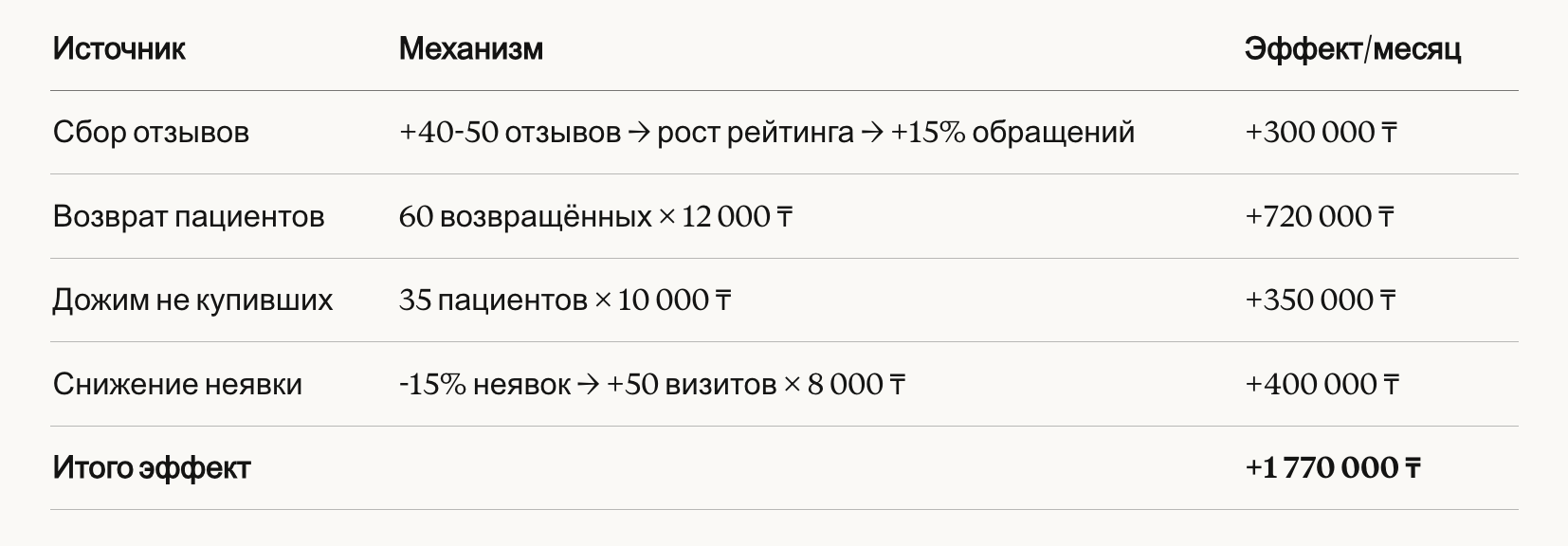 - Эффект: +1 770 000 ₸/месяц