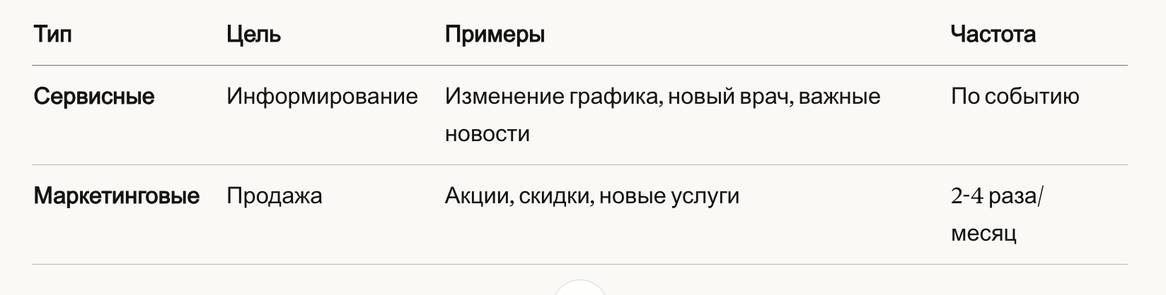 - Персонализация ({{Имя}}, {{Дата}}, {{Врач}})