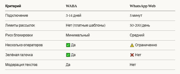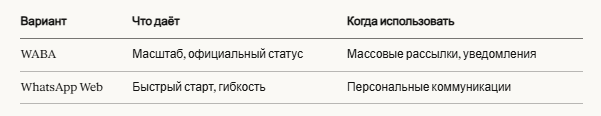 ✅ Два способа подключения — WABA для масштаба, Web для быстрого старта