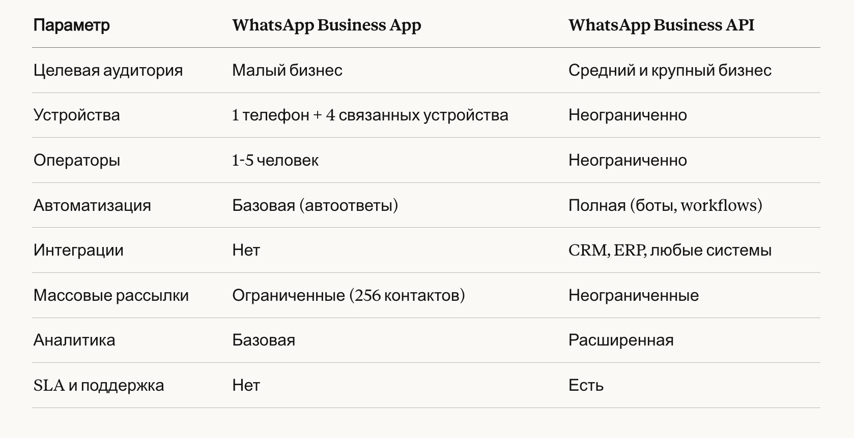 Для enterprise WhatsApp Business App не подходит по определению: нельзя масштабировать, нельзя интегрировать, нельзя автоматизировать.