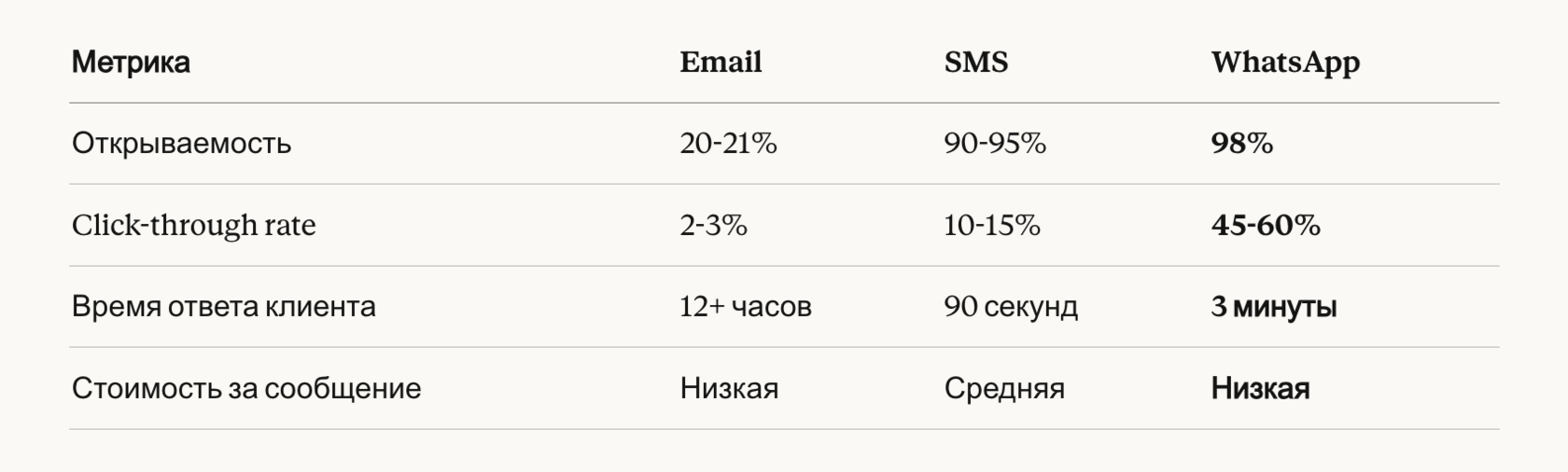 - WhatsApp обеспечивает 98% открываемость и 45-60% CTR — в 20-30 раз выше, чем email.