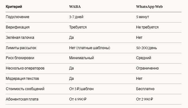 - Два варианта подключения — WABA для масштаба, WhatsApp Web для быстрого старта