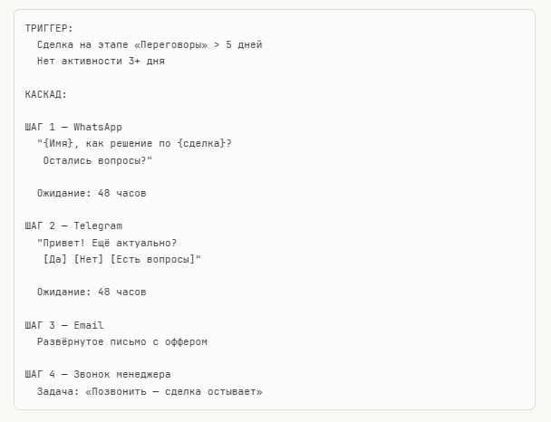 - Каскады доставляют сообщение через оптимальный канал — WhatsApp → Telegram → SMS