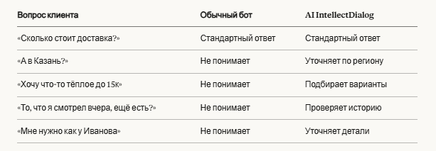 - AI-ассистент отвечает 24/7, консультирует на уровне опытного менеджера, передаёт сложные случаи людям