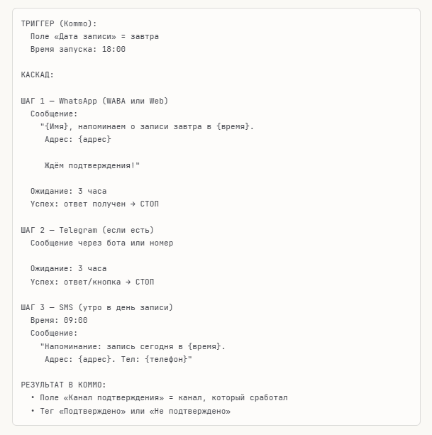 - Каскадных сценариев (WhatsApp → Telegram → SMS)