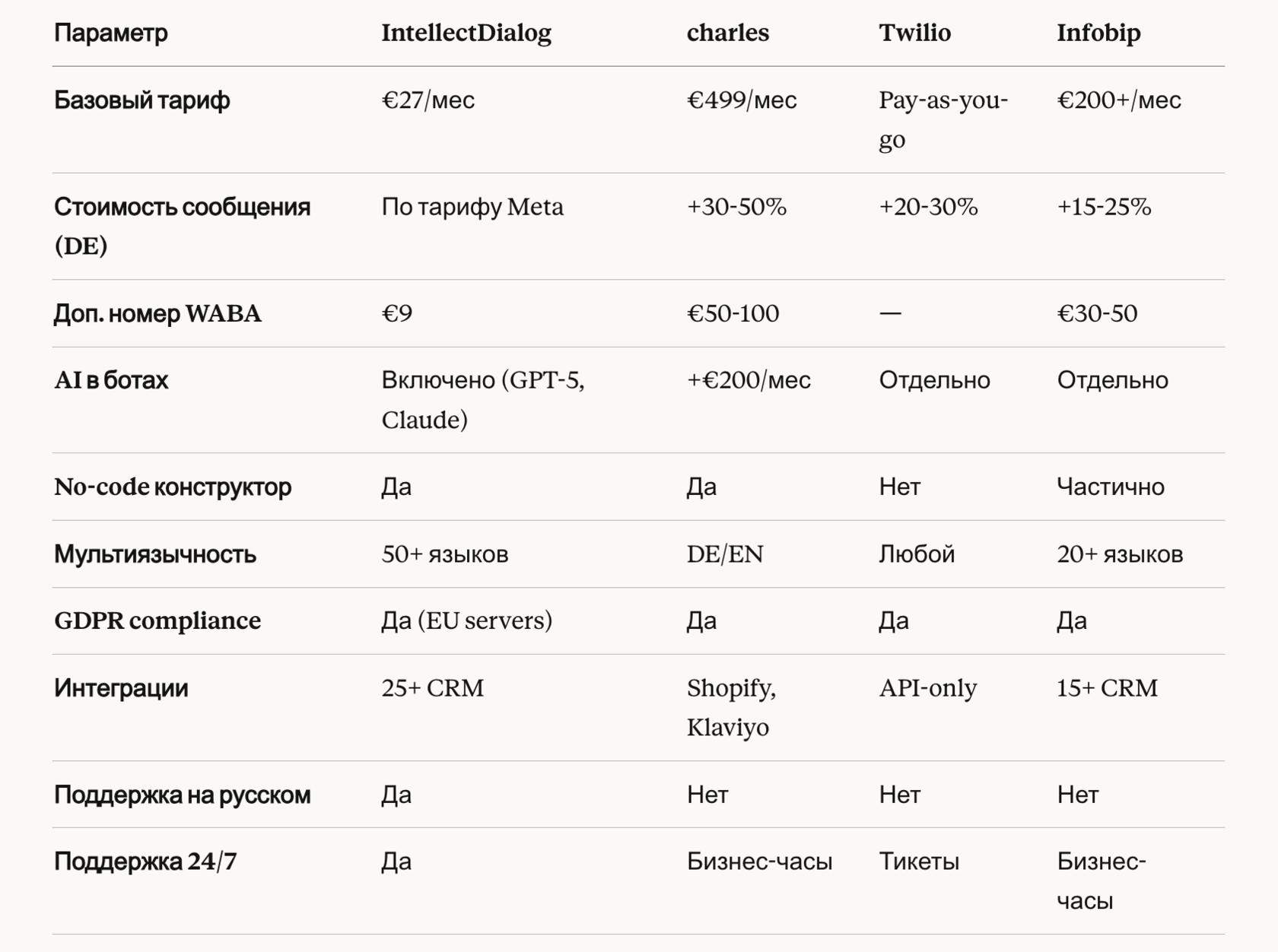 Чтобы понять реальную ценность WhatsApp-маркетинга, нужно сравнить его с каналами, которые бизнес уже использует. Данные собраны из отчётов charles, Infobip, Gartner и кейсов немецких компаний за 2024-2025 годы.