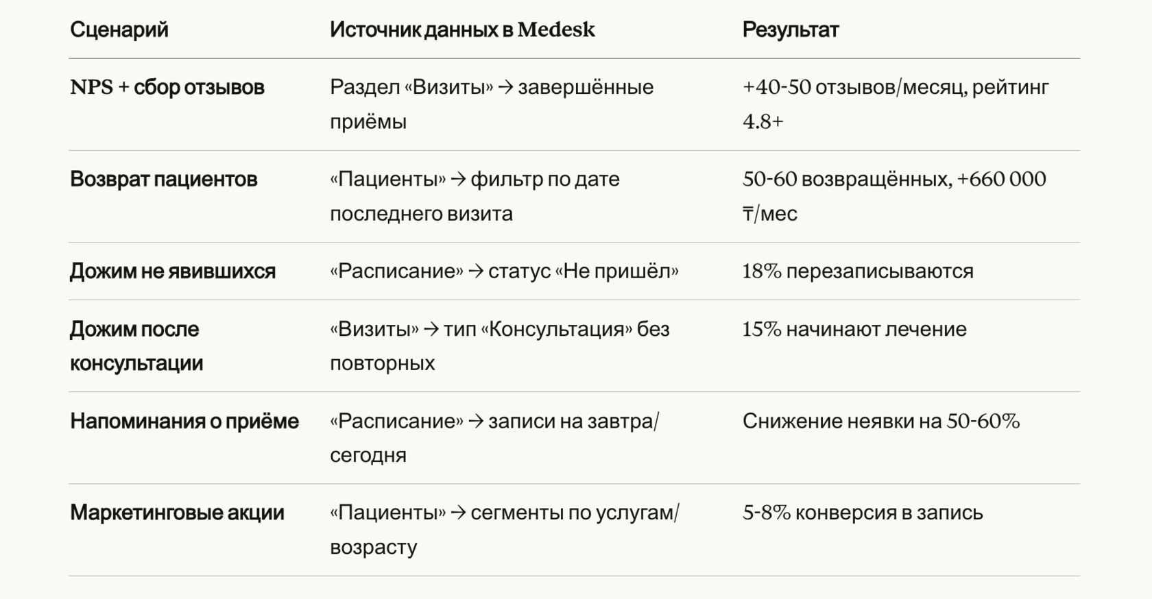Возврат пациентов: 50-60 × 12 000 ₸ → +660 000 ₸/мес