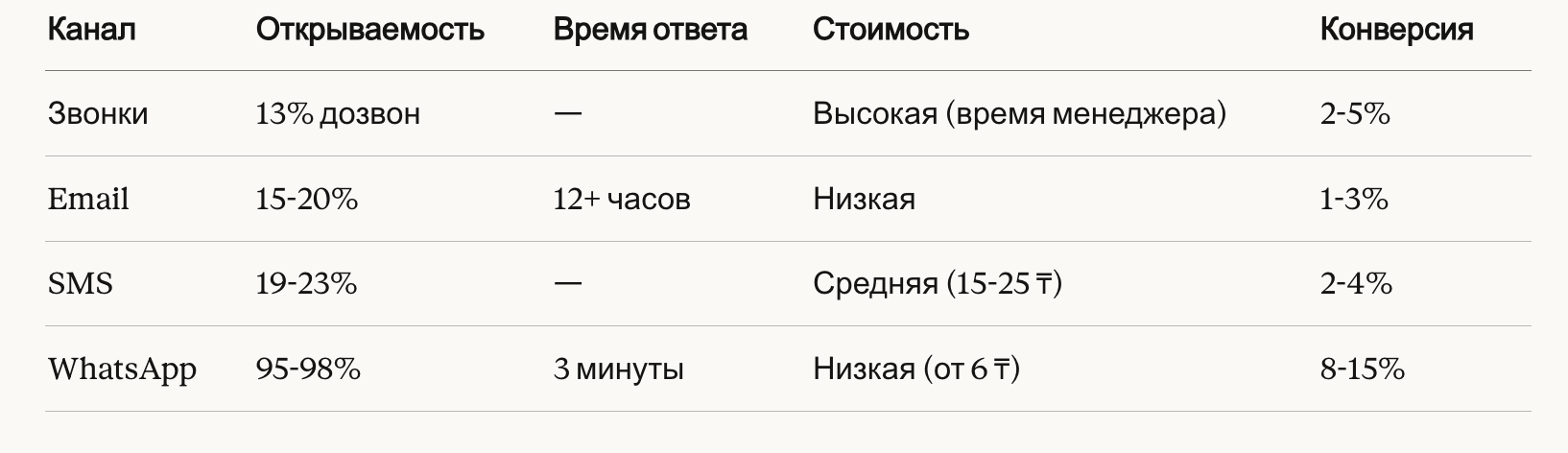 При средней стоимости привлечения лида в недвижимости 2 000 - 10 000 ₸ (реклама) — стоимость реактивации через WhatsApp в 300-1500 раз ниже.