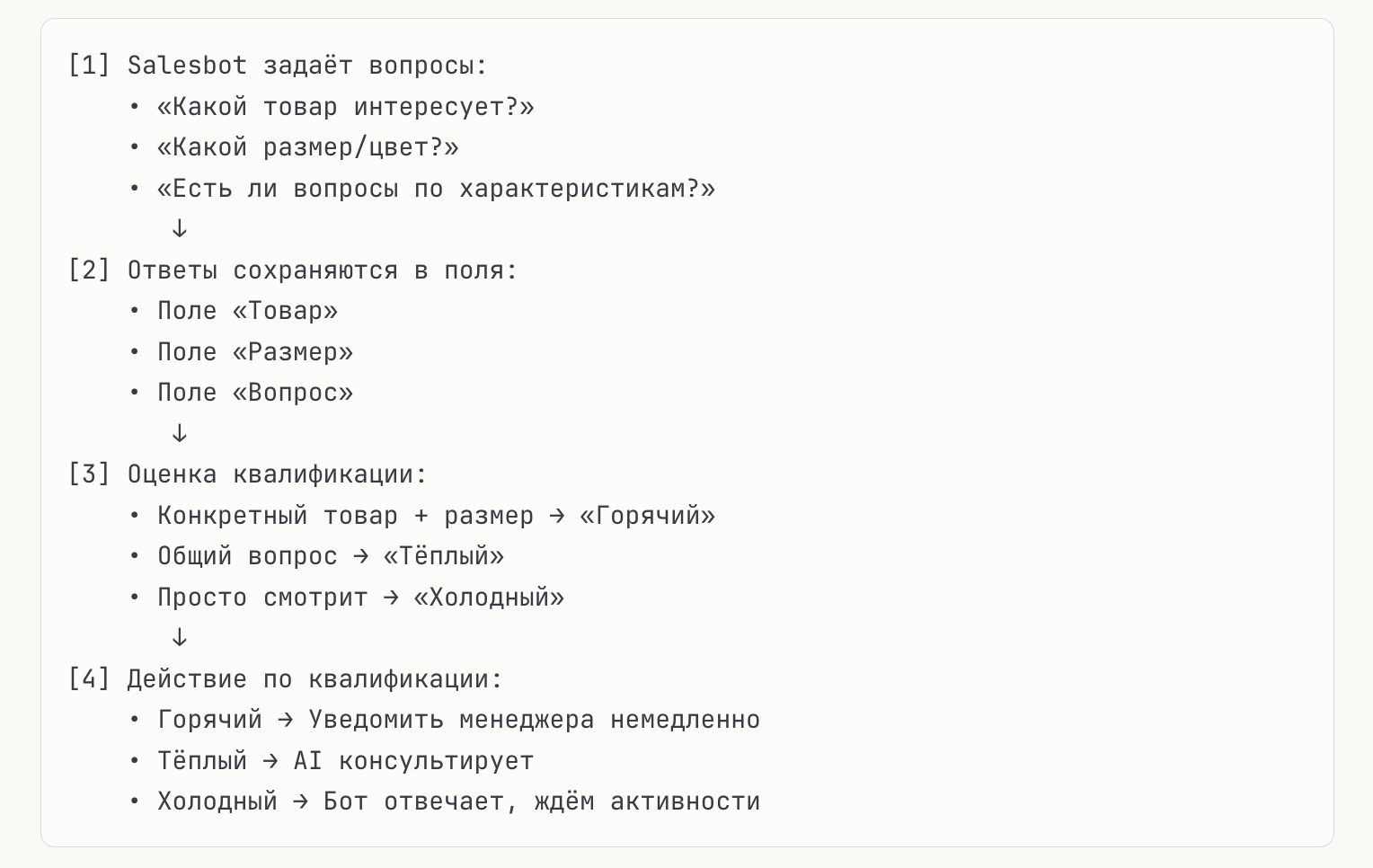 - Salesbot ведёт покупателя по воронке автоматически