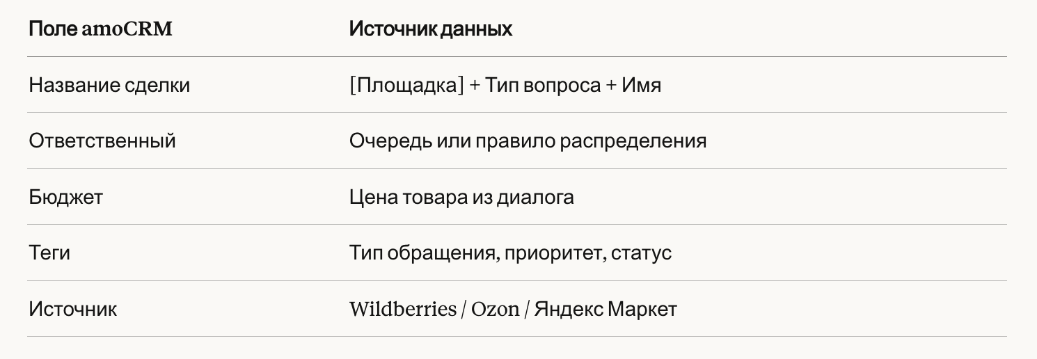 - Создаются сделки с источником (WB/Ozon/YM)