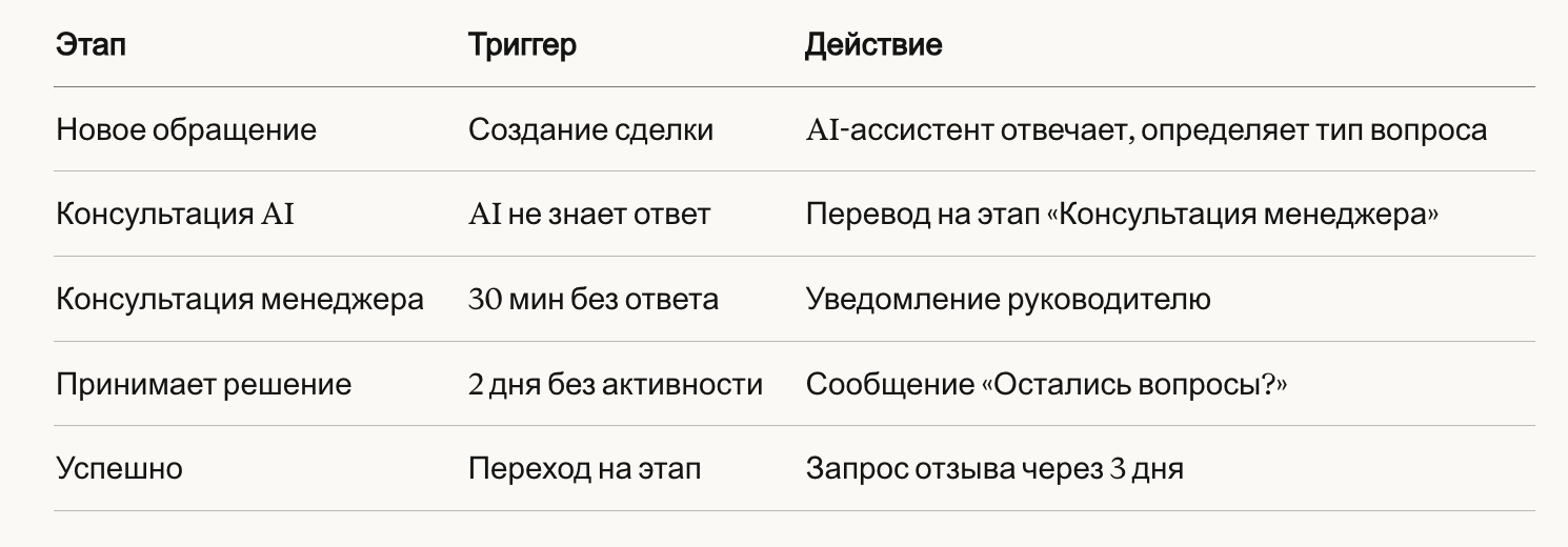 - Триггеры создают задачи и двигают сделки