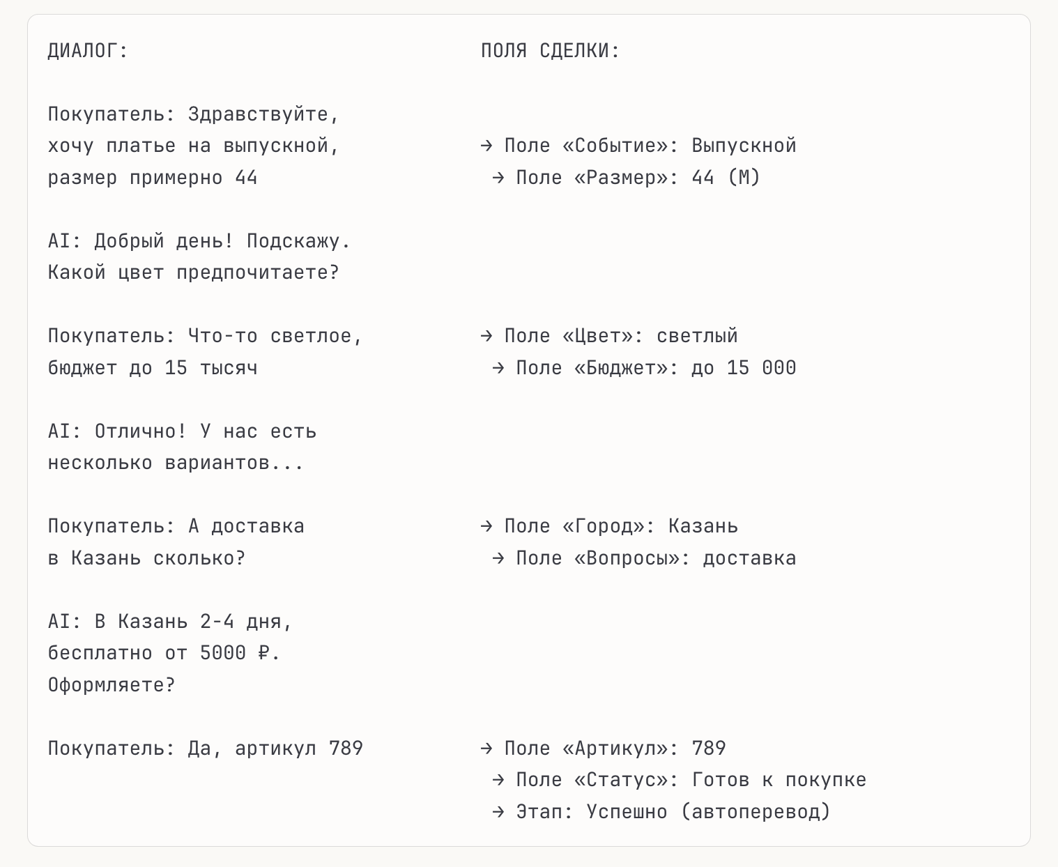- Заполняет поля — ответы покупателя сразу в карточке сделки