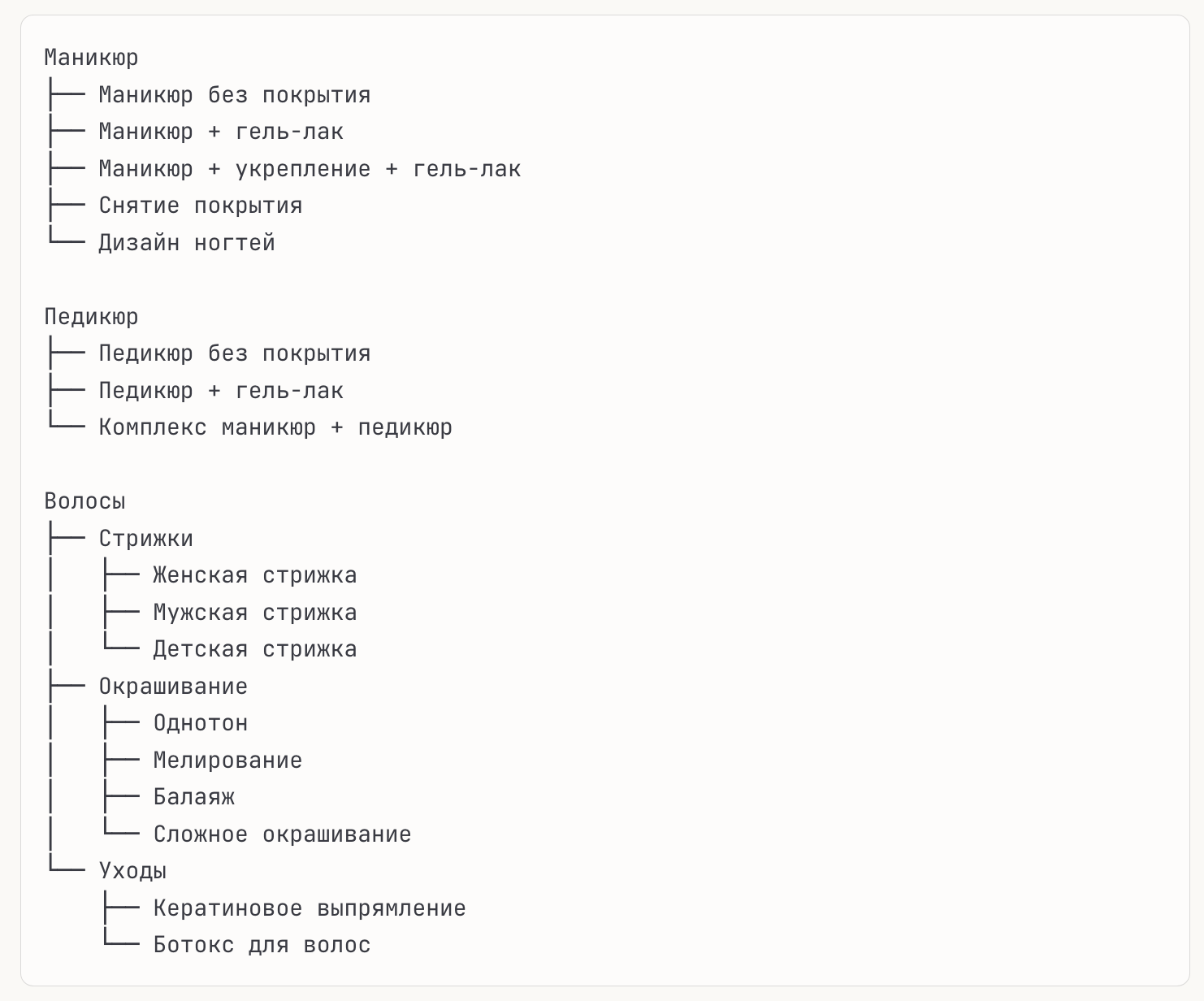 • Маникюр без покрытия — 800 ₽ • Маникюр + гель-лак — 1 500 ₽ • Маникюр + укрепление + гель-лак — 1 900 ₽ • Дизайн — от 50 ₽/ноготь
