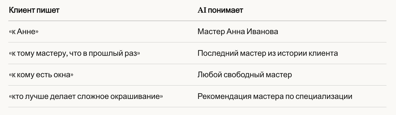Клиент хочет спросить: «А этот мастер делает сложное окрашивание?», «Сколько времени займёт?», «Можно чуть позже, часов в 6?»