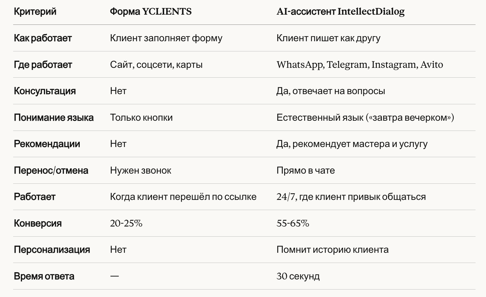 Вывод: Форма YCLIENTS — базовый инструмент. AI-ассистент — следующий уровень.
