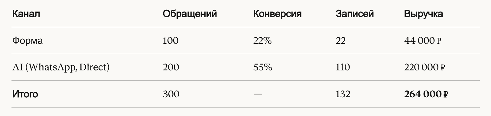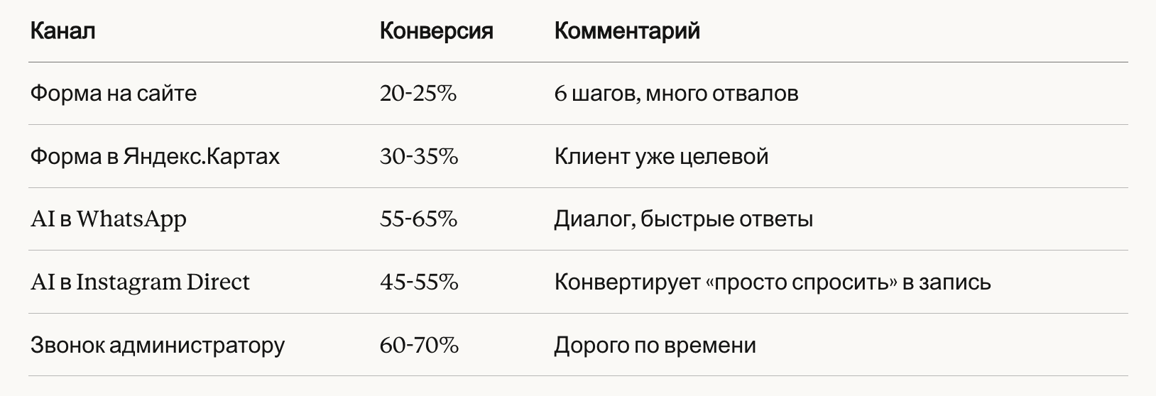 AI-ассистент даёт конверсию как у живого администратора, но работает 24/7 и не тратит время.
